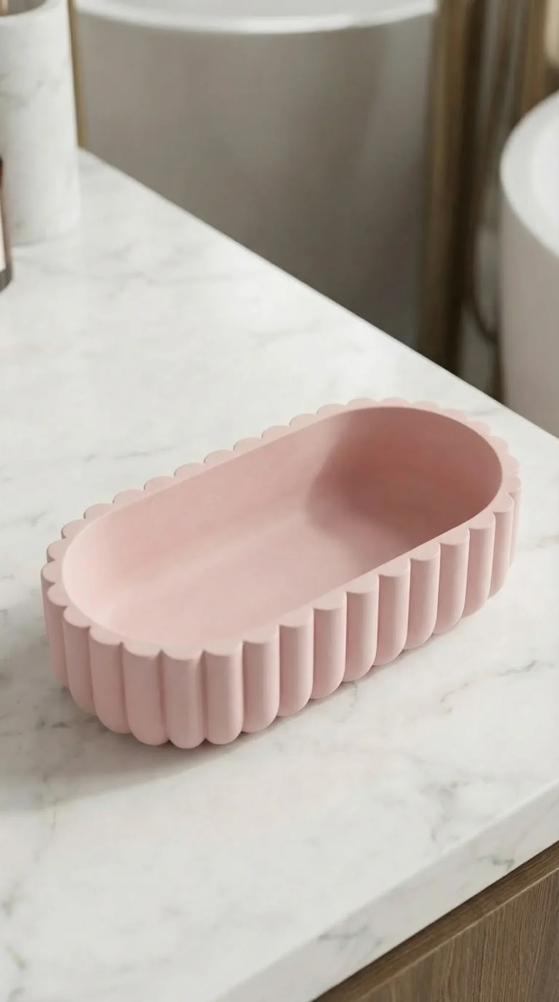 Bølgekantoval – En elegant oval form med myk bølgekant som gir et lett og dekorativt uttrykk. Kan tilpasses i flere farger for å matche ulike interiørstiler.