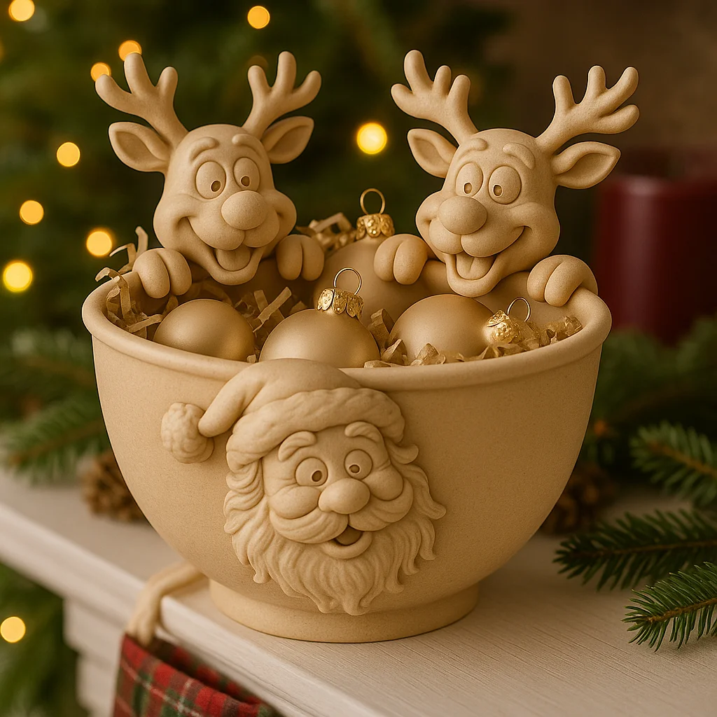 Santa & Reindeer Festive Catchall Bowl – Christmas Candy Dish & Holiday Decor – 3D Printed STL