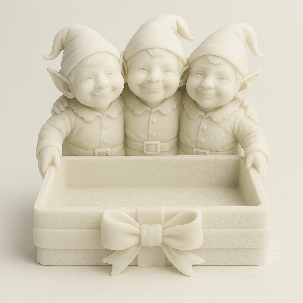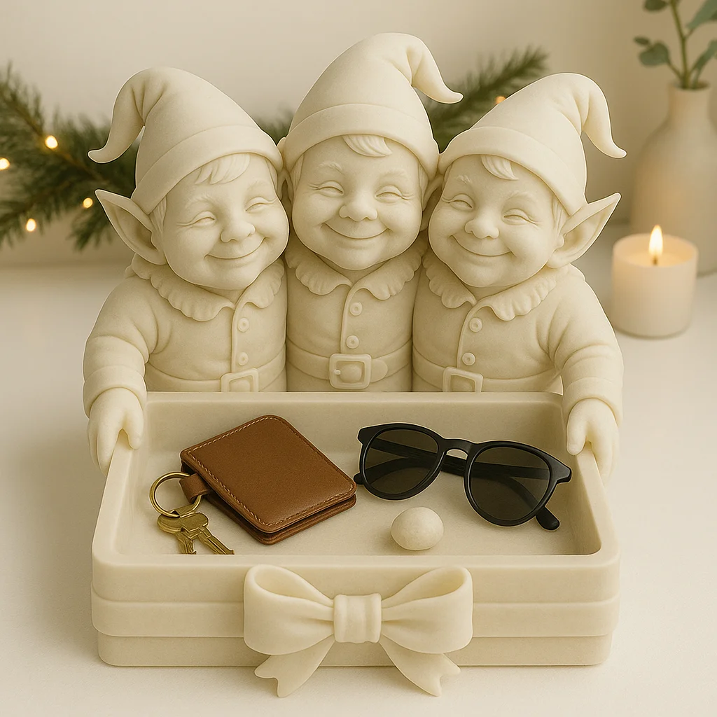 Three Elves Holiday Catch-All Tray – Matte Ivory 3D Printed Entryway Organizer | Christmas Decor Gif